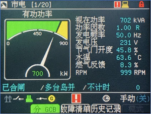 (3)機組可實現遠程啟停,有功功率及無功功率的自動調整,自動同期,滿足自動化機組的需要。保護功能齊全,有發動機超速、油壓低、水溫高、機油溫度高等發動機保護,也有逆功、過流、欠壓/過壓、欠頻/過頻等發電機保護功能。顯示器:顯示參數齊全,滿足顯示、參數設置、報警、歷史記錄等需要。